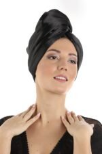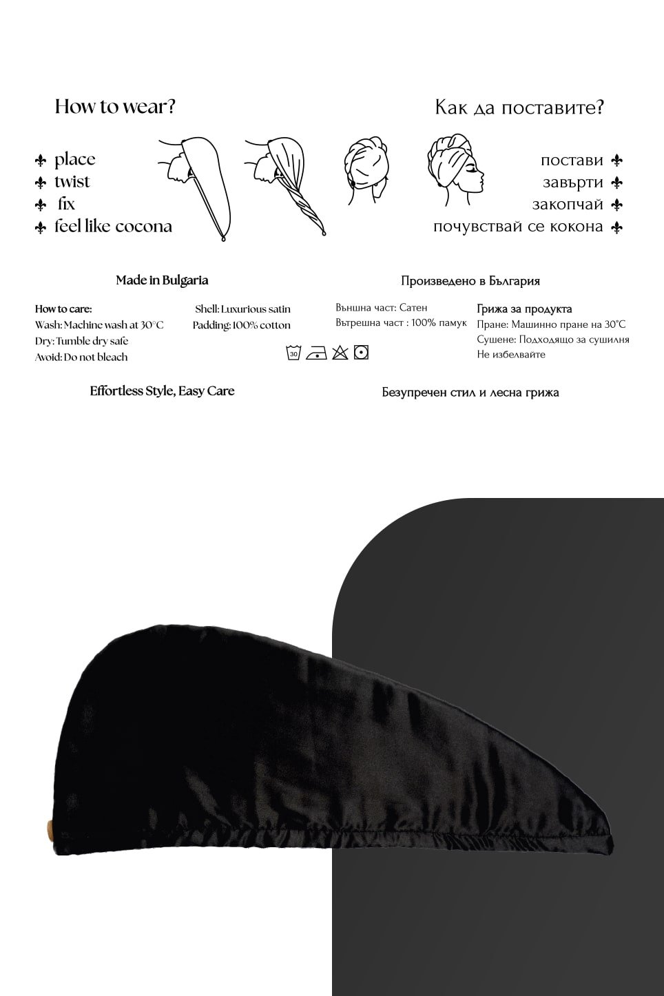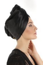 Satin head scarf BLACK SATIN – an expression of elegance and refined taste. Made from soft satin with a silky effect on the outside and absorbent cotton lining on the inside, it is gentle on the hair and comfortable to wear, combining style and care in one. The dark color conveys a sense of finesse and mystery, while the delicate satin sheen adds sophistication and smoothness to the design, turning the scarf into a classic yet striking accessory.