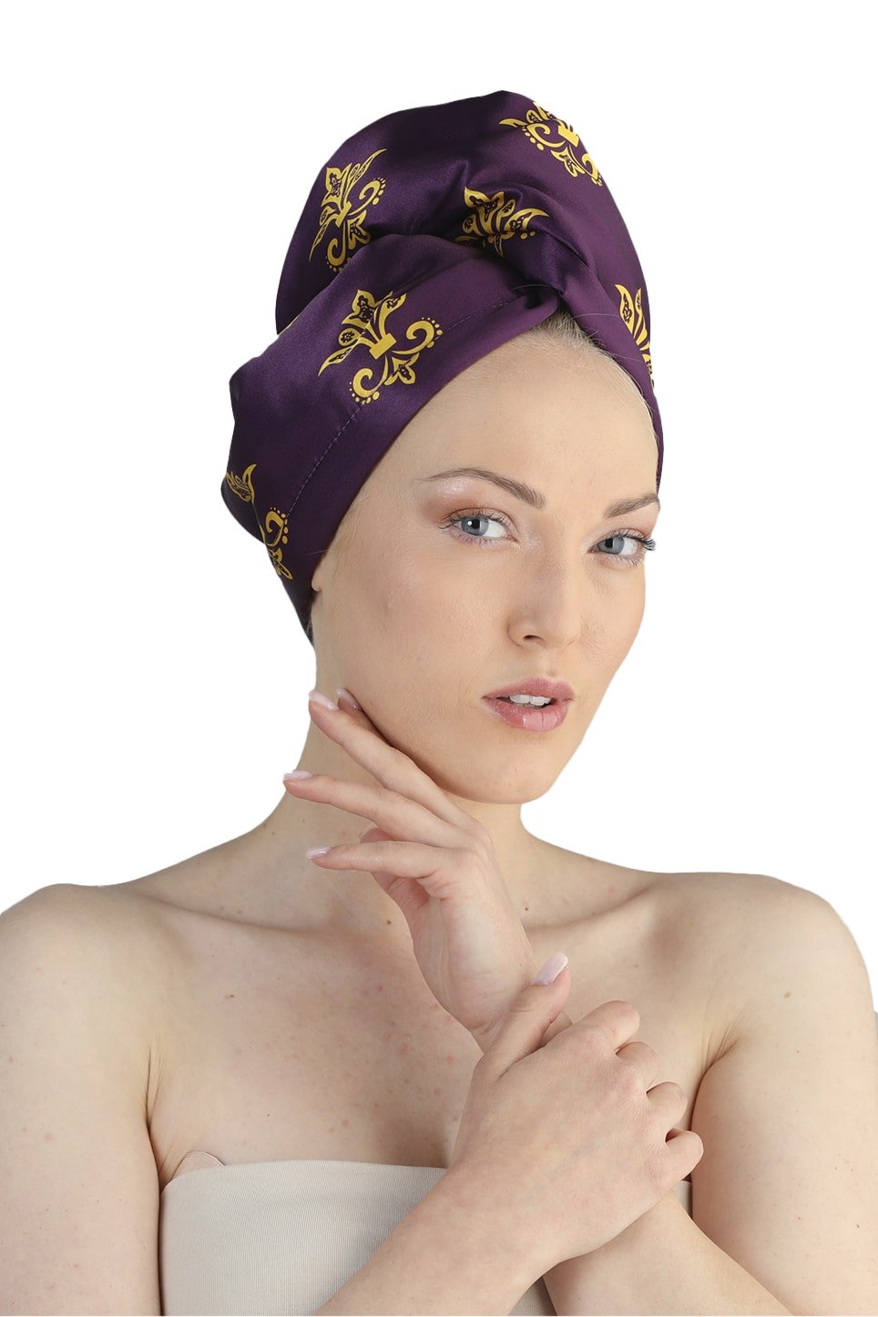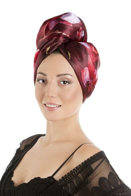 Satin head scarf FLORENCE – inspired by the classical beauty and artistic spirit of the Italian Renaissance. Made from soft satin with a silky effect on the outside and absorbent cotton lining on the inside, it is gentle on the hair and provides comfortable wear, combining style and care. The rich purple background and delicate golden accents, reminiscent of historic Florence, convey a sense of nobility and elegance, while the subtle satin sheen highlights feminine refinement and artistic spirit.