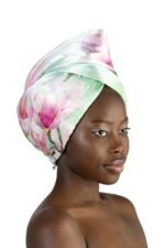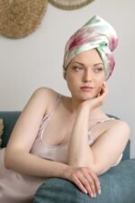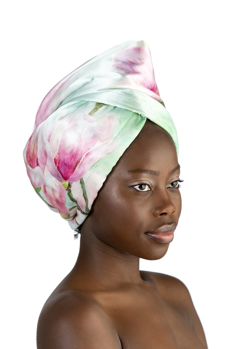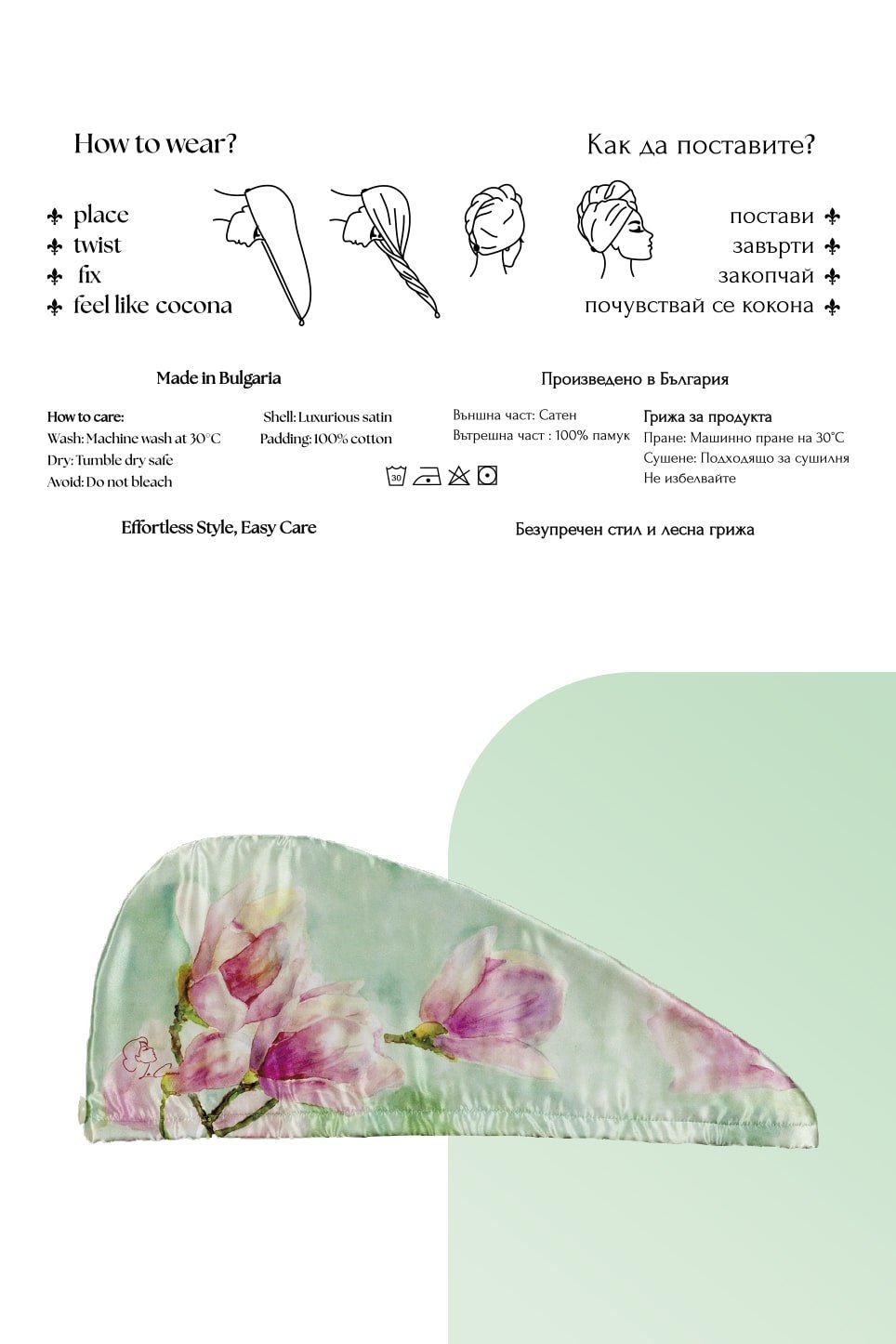 Satin head scarf MAGNOLIA – a symbol of tenderness, beauty, and perfection. Made from soft satin with a silky effect on the outside and absorbent cotton lining on the inside, it is gentle on the hair and provides comfortable wear, combining style and care. The white and pink magnolia flowers are arranged with attention to detail, creating ethereal and delicate patterns, while the green background conveys a sense of balance and calm, making the scarf an elegant and practical accessory.