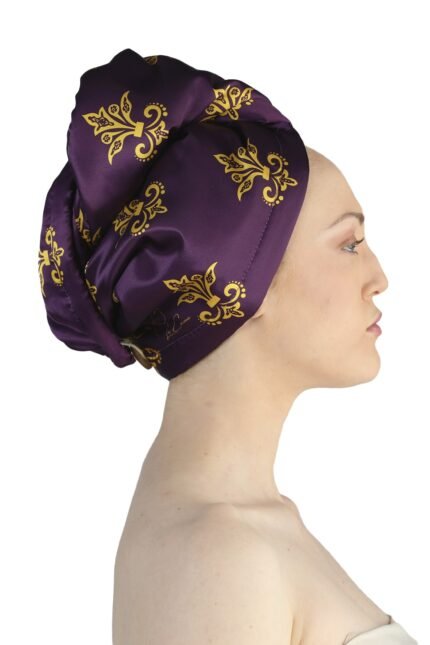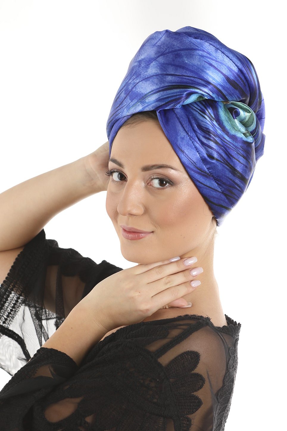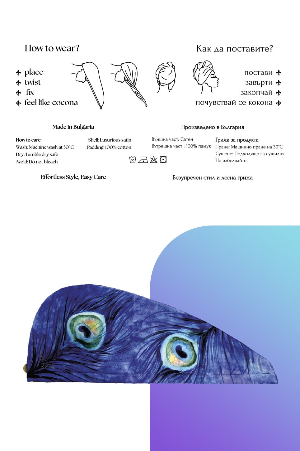 Satin head scarf PEACOCK’s – a symbol of elegance and confidence, inspired by the beauty of one of nature’s most impressive creatures. Made from soft satin with a silky effect and lined with absorbent cotton on the inside, it is gentle on the hair and comfortable to wear, combining care and style in one. The deep navy blue shade conveys a sense of calm and sophistication, adorned with delicate peacock feathers highlighted in blue and green accents. This design creates a unique feeling of harmony, confidence, and refinement – an expression of strong feminine essence.