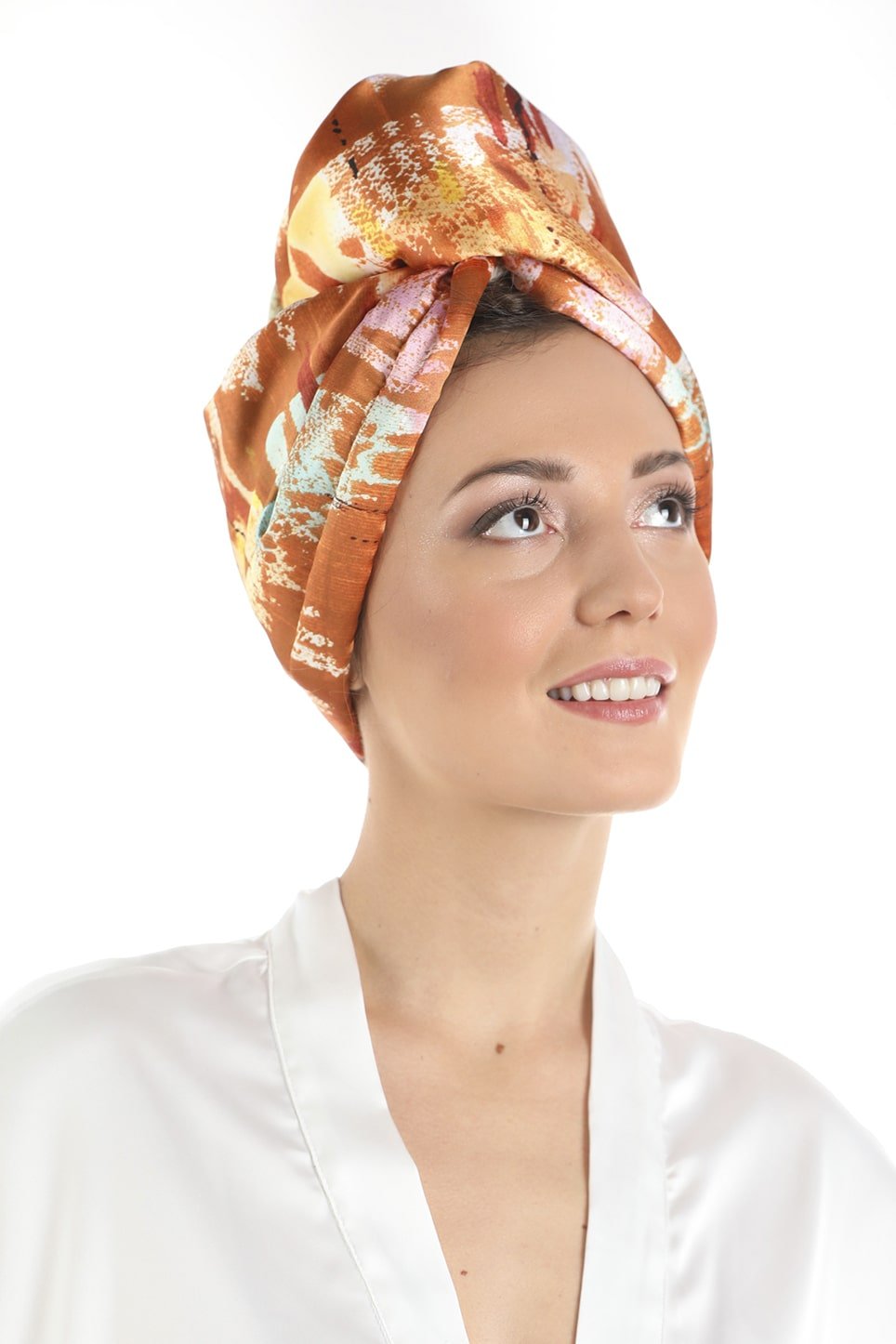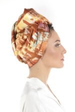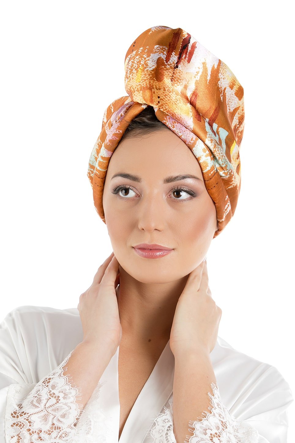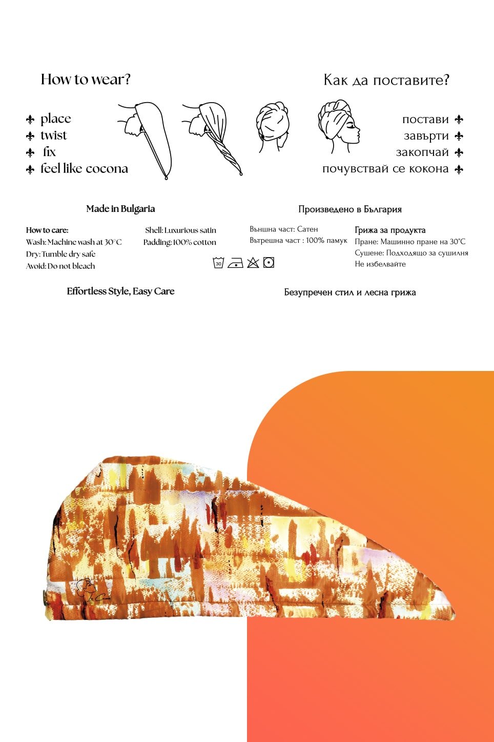 Satin head scarf SAHARA– the perfect way to bring warmth, energy, and freshness into your look. Made from soft satin with a silky effect on the outside and absorbent cotton lining on the inside, it is gentle on the hair and comfortable to wear, combining style and care in one. The warm shades of yellow, orange, and gold create a feeling of vitality and positivity, reminiscent of a soft sunset, turning the scarf into a remarkable accessory that adds light and warmth to every moment.